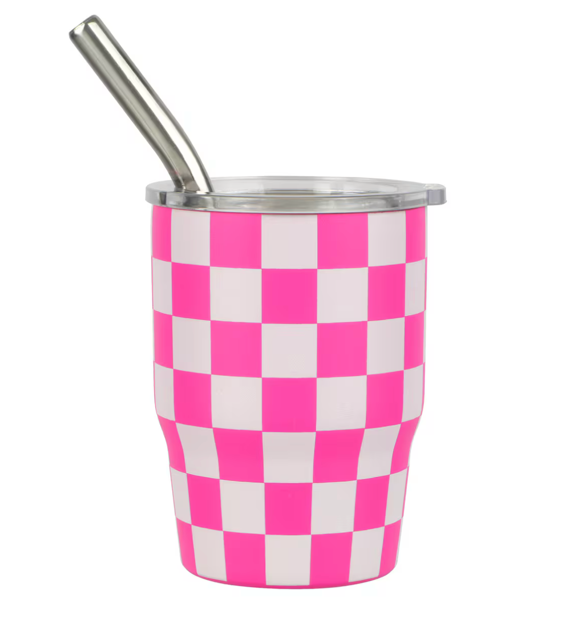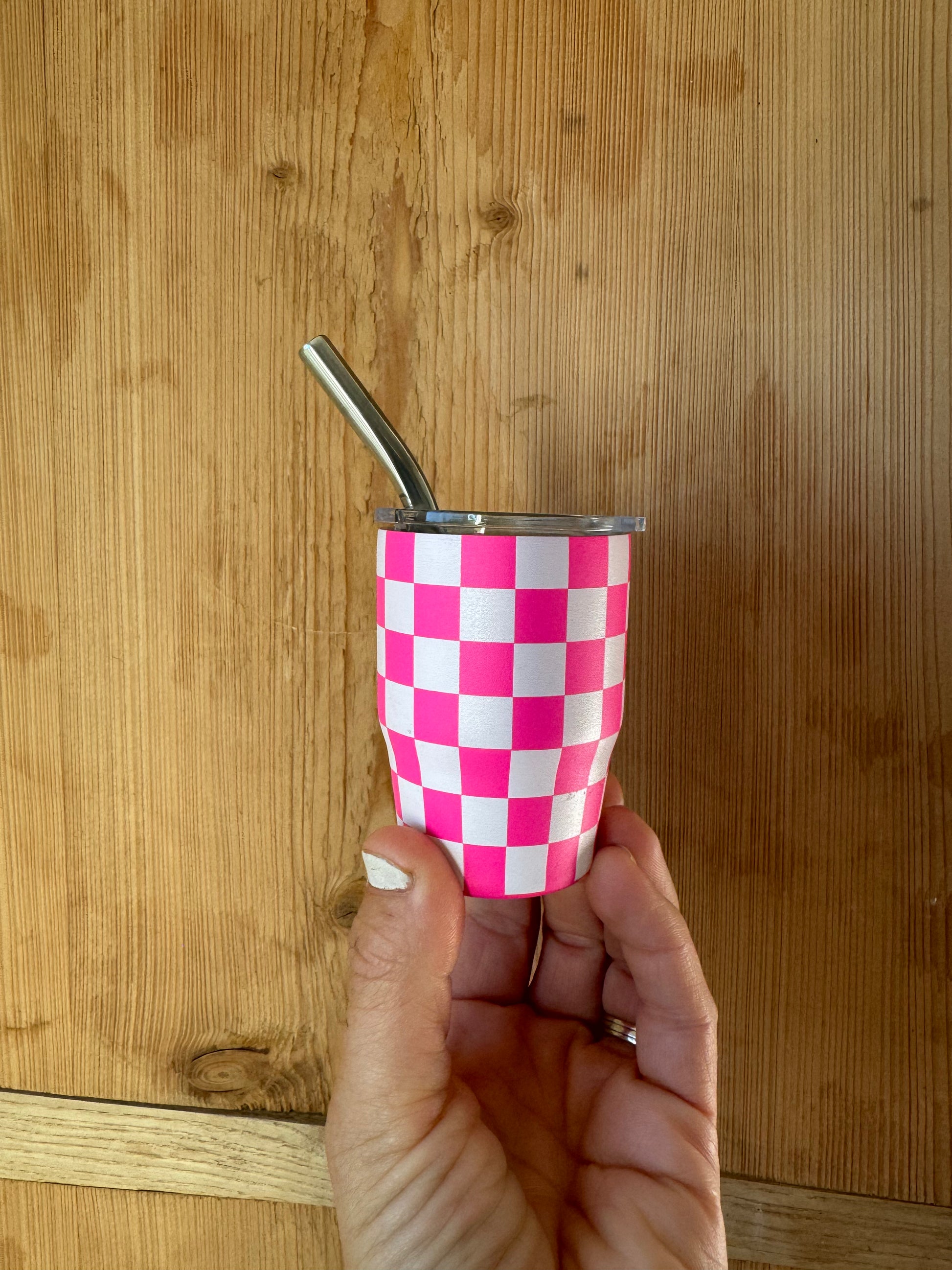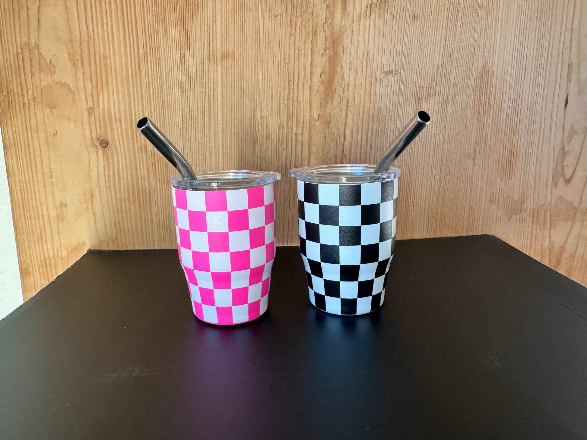 Introducing our vibrant and versatile Checkered Stainless Steel Shot Glasses with Lid and Metal Straw – a must-have addition to your party and travel essentials!